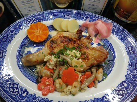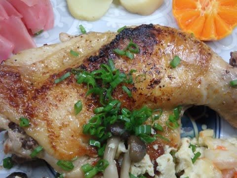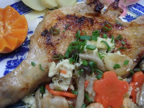 骨付きチキンは、塩コショウ、蒸し焼きにして身は柔らかに仕上げた。